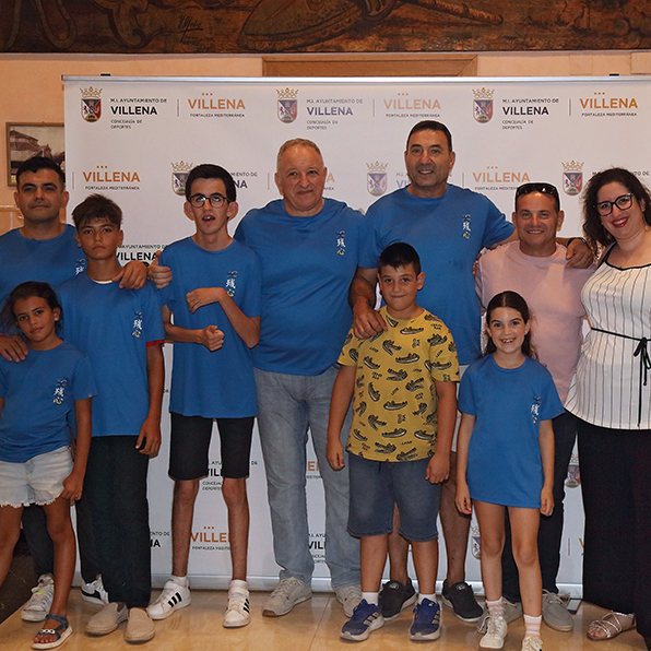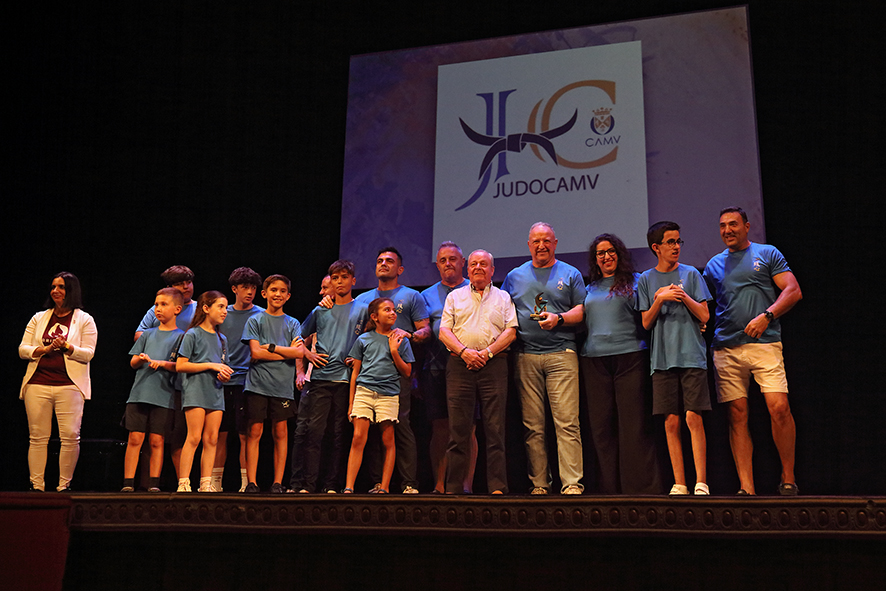 Subimos al escenario judokas de todas las generaciones, desde los benjamines que aún se hacén lio con el un cinturón hasta nuestro veterano Herminio Bañón, pionero intrépido que puso el primer pie descalzo en el tatami villenense allá por 1965.